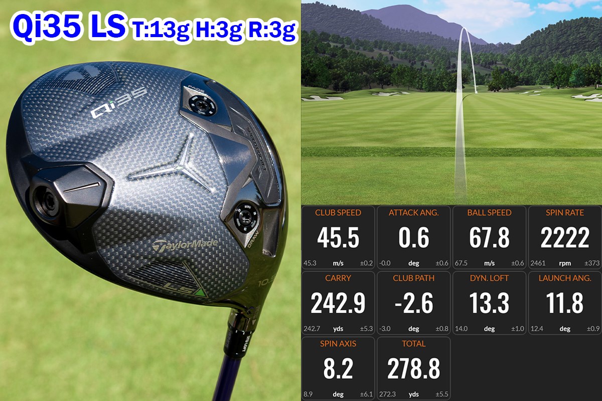 テーラーメイドの新作「Qi35」シリーズのドライバーは「Qi35」(以下、コアモデル)、「Qi35 MAX」(以下、MAX)、「Qi35 LS」(以下、LS)の3モデル。まずは、“10K”を達成し、最大級のMOI(5934 g・cm2)を備える「MAX」から試打をスタート。