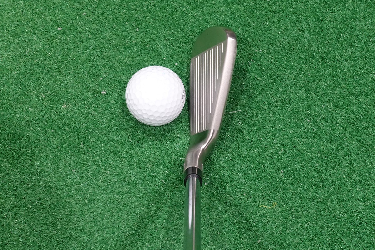 構えてみると、大きめのヘッドと厚めのトップブレードが目に入ってきて、いかにもやさしく打てそうな雰囲気。ただし、少しフェースが左を向いているようにも感じます。