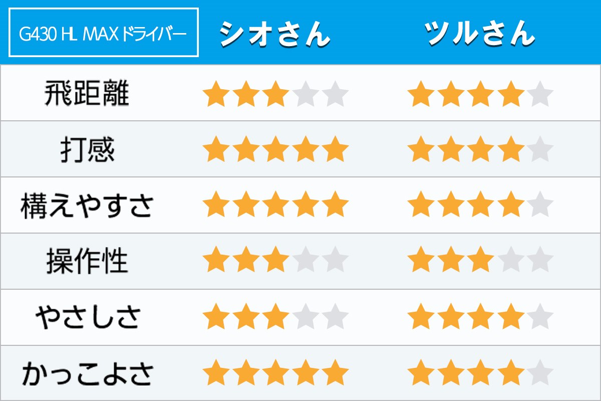 このモデルだと球をつかまえきれず、スッポ抜けのミスが出るのも気になりました。こうした傾向は、従来の「G430 MAX」を試打したときと同じですね。ツルさんの言う通り、軽量設計の「HL」シリーズでもヘッドの基本性能は従来通りだと思います。やっぱり僕には、ヘッドのヒール側に重心が寄せてある「SFT」のモデルのほうが合っているみたいです。
