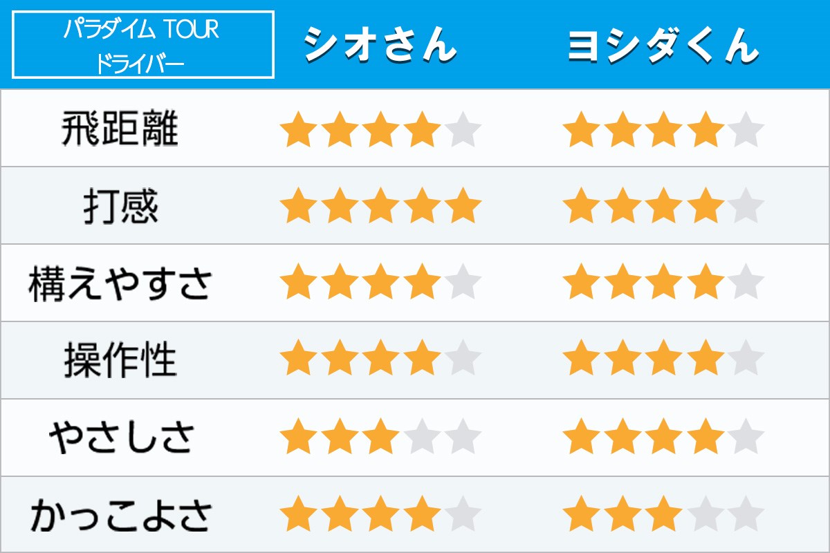 今回新たに加わったツアーバージョン2機種の中でも打球方向とスピン量の安定感が魅力的な「パラダイム TOUR」。ヘッドスピード50m/sのヨシダくんが打っても、左へのひっかけや右にプッシュするボールが一球も出ませんでした。ヘッドスピード45m/以上の中・上級者にとっては、高確率でフェアウェイにボールを運べる優秀なドライバーだと思います。