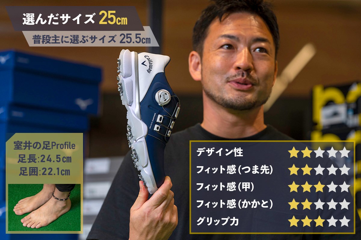 ラップタイプ仕様となっており、サイドから全体を包み込むようにホールドしてくれるので、全体に均一な圧がかかり心地よいです。ただ、つま先部分のホールド感は弱く、ワンサイズ小さめにすると、ちょうど良いでしょう。サイドから見たアウトソール形状や、ラップ仕様は他に少なく、ゴルフ場で映えるのは間違いないです。(塩田)