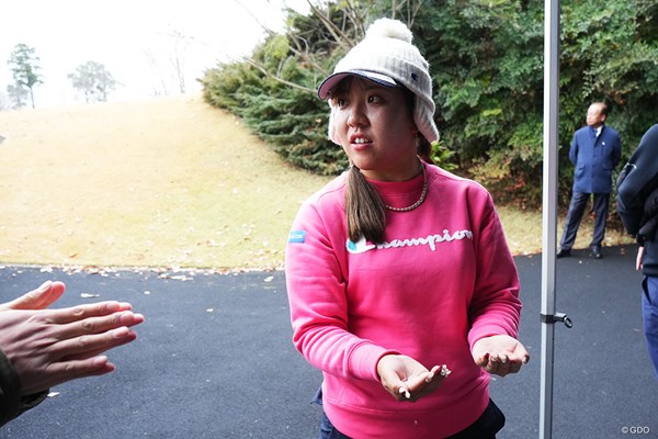 滑り止めを手に取り、水をかけてもらう仁井優花
