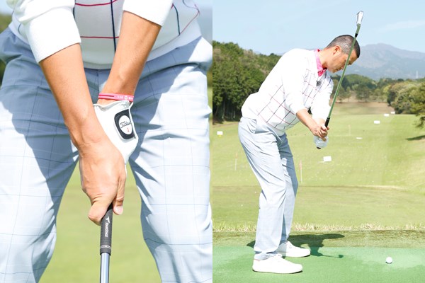 ウィークグリップは右手が大きくかぶってしまうのが問題。テークバックは関節の向きに従って強いアップライトになる
