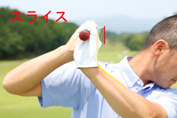 左手甲の向きとフェースの向きは同じ正面となります。インパクトではフェースが右に向いてしまい、スライスの原因になります
