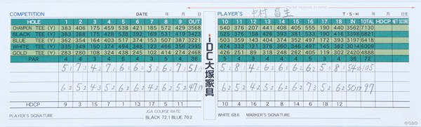 N村のスコアカード。上段が1人で回った時のスコア(105)で、下段が磯さんのアドバイスを受けながら回ったときのスコア(97)。3パットと大叩きしたホールの数が減ったことがスコア改善につながった
