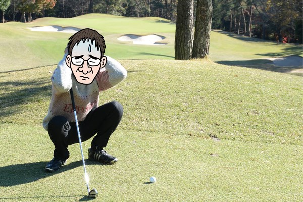 14番ホールは距離の長い打ち下ろしのパー4。ティショットのナイスショットがフェアウェイ中央の木の前に。木とピンが重なり、ここからグリーンまで4打を要する