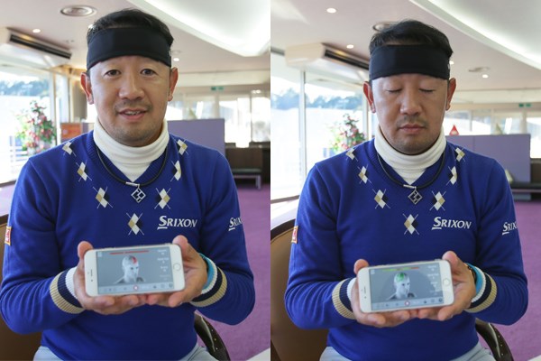 田島プロが頭に巻くバンドから脳波を計測し、画面を通して左脳と右脳のモード切り替えを行う。目を閉じた状態(右写真)が右脳モードで、画面の脳の色の変化が分かる(2016/01/08)