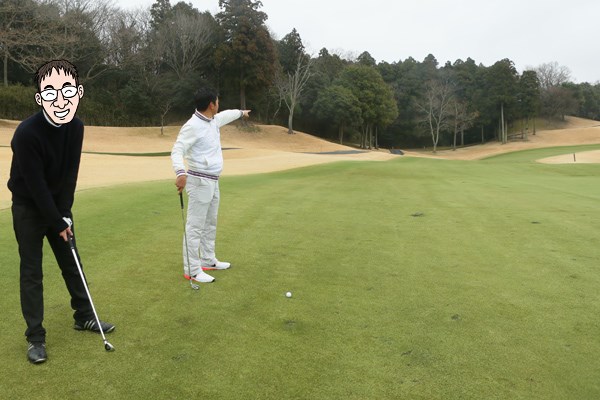 セカンドショットの狙い方についてアドバイスを受ける。池の上からグリーンを目指すN村に対し、プロから池に極力かからないルートを推奨される(2016/02/26)