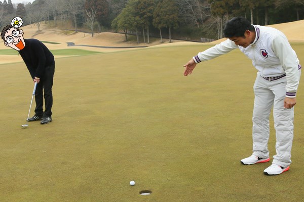癸生川プロの手招きに誘われるように、N村のファーストパットはカップに吸い込まれた(2016/02/26)