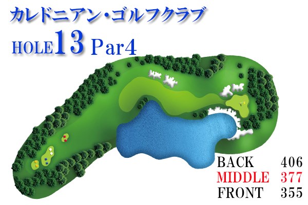 カレドニアン・ゴルフクラブの象徴的なホール。ティショットで池越えは可能だが、リスクを冒さないのも有効な手段。グリーン回りには美しいビーチバンカーがゴルファーの目を楽しませる