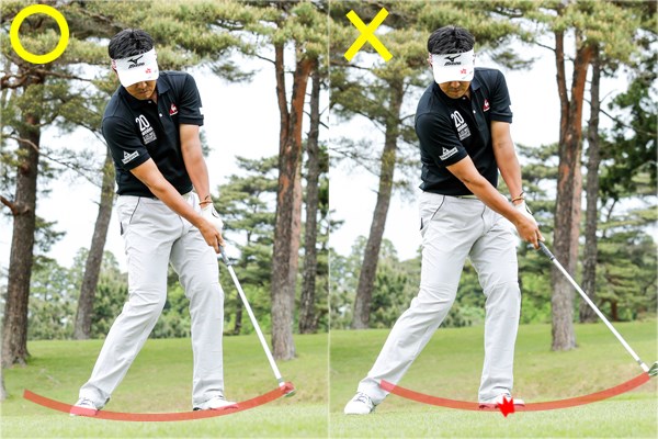 傾斜地でも当てて終わりのスイングではなく、フィニッシュまでバランスよく振り切ることがナイスショットの絶対条件! 「傾斜に逆らう」と、フォローでヘッドが突っかかりやすくなります。「傾斜なり」のほうが、基本的にフィニッシュまでしっかり振り切ることができるイメージですね。