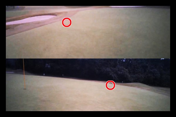 更に次打のパットが楽になるエリアと、外してはいけないエリアを確認し、アプローチの落とし所を決めてからボールに戻ります。ボールに戻ってからは、必ずボールの真横ではなく真後ろに立って落とし所を確認してみてください。ボールの横ではなく真後ろから見ることで、ボールと目標を縦のラインで結ぶことではじめて方向性が明確になってくるからです。