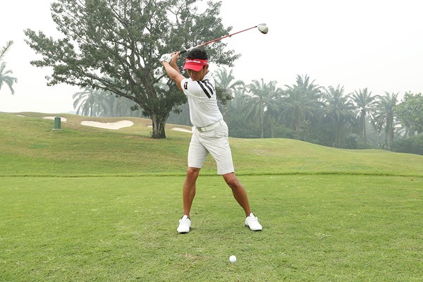 テークバックからトップまでの動きでポイントとなるのが始動のきっかけです。ヘッドの動きだけを意識すると手先の動きが入ってしまうし、肩の回転だけを考えていると、腕の動きがおろそかになる。腰の高さまではアドレス時の両肩と腕の形を変えずに動かすのがポイントです。始動のきっかけは自分のとりやすいタイミングを見つけることが大切です。