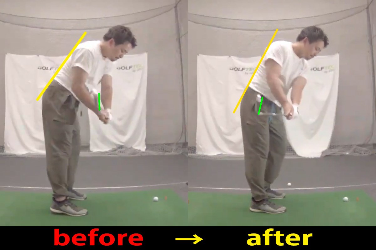 ドリル後のスイング映像をレッスン前と見比べると、ダウンスイングで上を向いていたフェースが前傾角度に近い角度に。手元も体から離れず、クラブヘッドもインサイドからの軌道に変化している。
