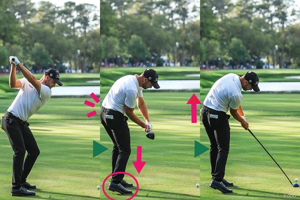 右足を踏みながら捻転差を保ってダウンスイング(写真中) インパクトでは伸展(右)(photo/Getty Images)(2024/04/09)