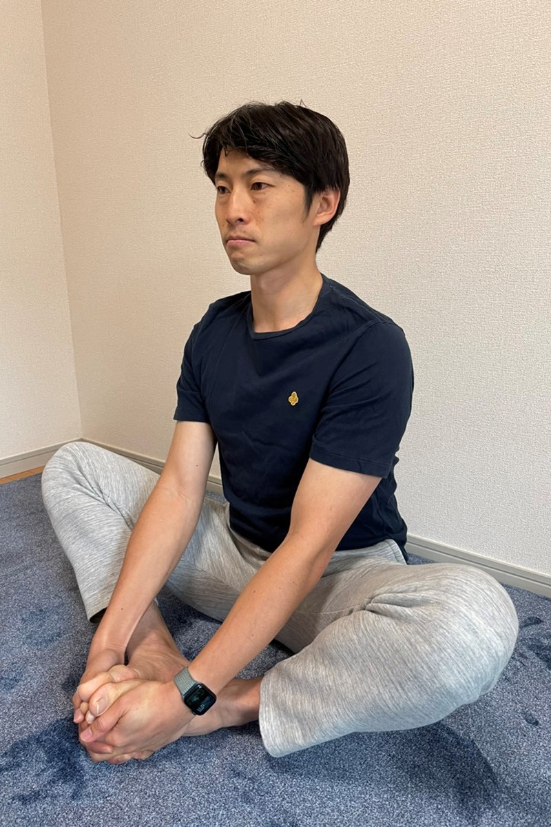 湯船のなかで両足裏をくっつけて左右のひざを底につけたり(写真参照)、開脚をしてみたりしてください。これは浴槽が広くないとダメですが、ご家庭にあるお風呂でも正座をして上半身のストレッチは可能です。体が硬い人はストレッチを嫌いますが、湯船では血行が促されストレッチ効果が高まります。ただ、湯温が高すぎるときや、体調が優れないときは行わないように気を付けてください。