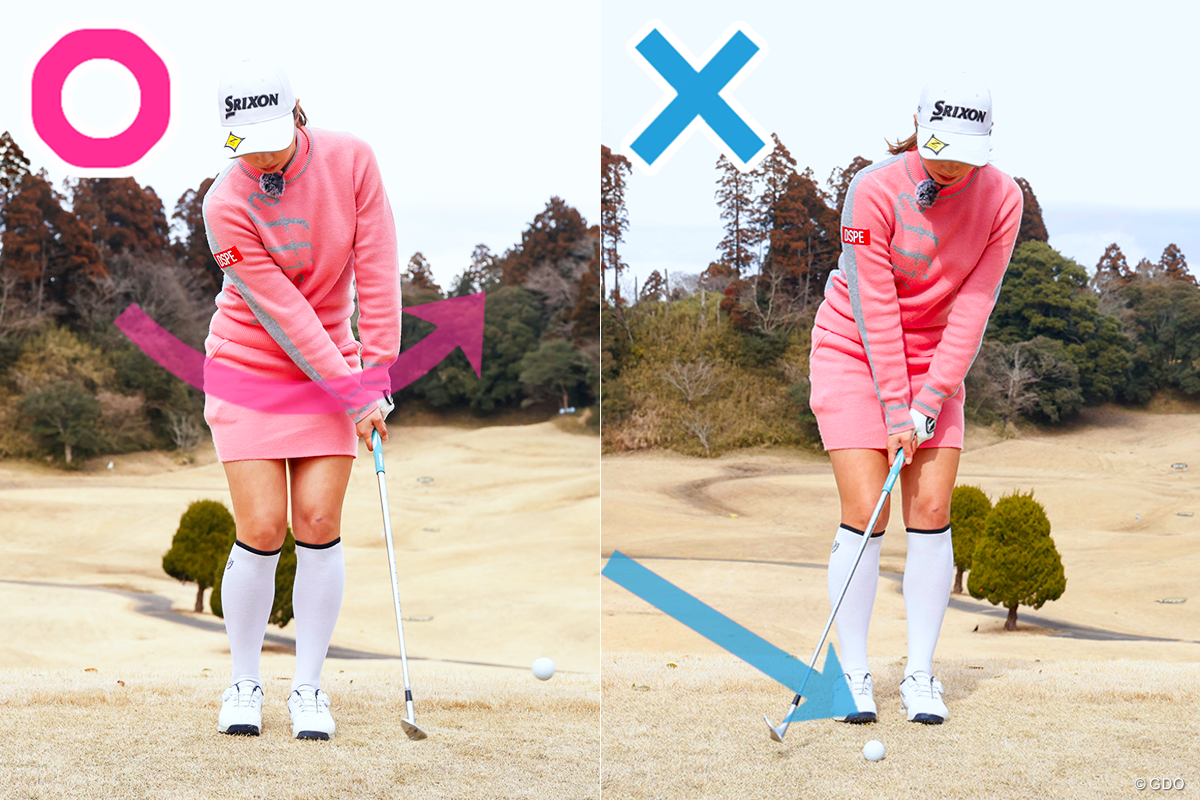 高さを打ち分ける練習としてあまり効果が出ないと思うのは、スイング軌道を意識したもの。ドライバーやアイアンショットほど違いが出ないため、大きな変化は必要ないと感じています。ボールの位置を変え、ボール回転をイメージするだけ。低弾道は右足寄りに置いてドロー、高弾道は左足寄りに置いてフェード。イメージに合わせ、体が反応できればGood!と考えましょう。