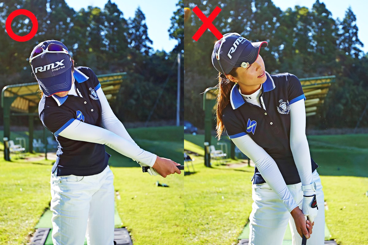 次に注意したいのが“トップ”のミス。トップしやすい人の特徴はフォローで体が起き上がってしまうこと。その多くがヘッドアップです。このケースでは、目でボールを追うようにしたり、頭を上げるタイミングをワンテンポ遅らせるのがポイント。クラブを短く持ち、フォローも小さくてよいので、ボールが視界から完全に消えてからゆっくりと目線で追いかけましょう。全体的にテンポをスローにしても効果があると思います。