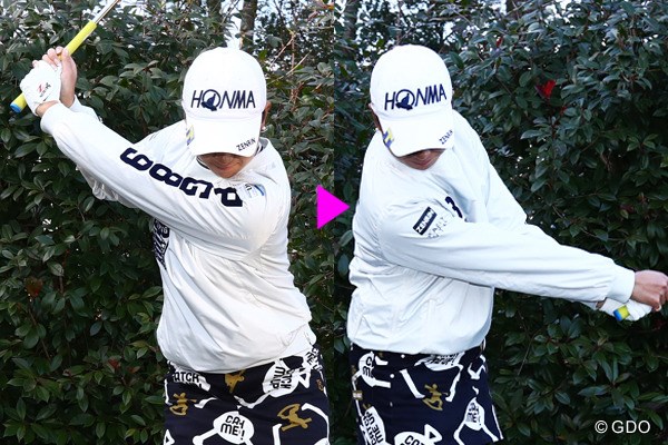腕のローテーションに頼らず体の回転で振るには、テークバックでは「右向け右」、ダウンからインパクト、そしてフォローにかけては「左向け左」のイメージを持つことです。基本中の基本と思う人はいるかもしれませんが、コントロールショットの精度を上げるにはこの動きにすることが一番の近道になりますよ。
