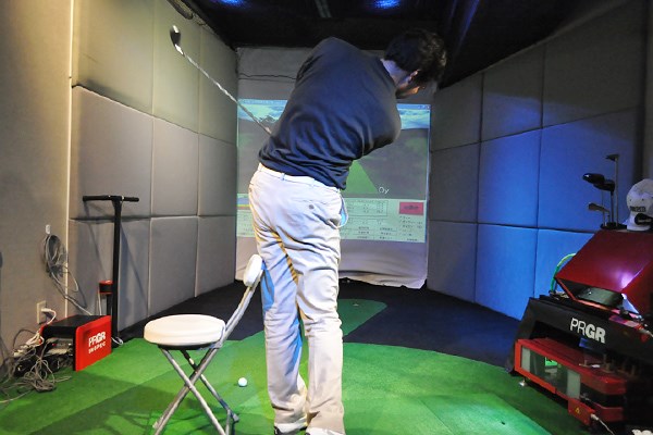 下半身リードという言葉に囚われてしまった人にも多く見られるのですが、要は腰の使いすぎなのです。回し過ぎる人もいれば、小池さんのように、どんどん左に突き出してしまう人もいます。腰の回転はもっと静かで些細な動きであることを自覚しましょう。このように後方に椅子を置いて、アドレスでお尻が軽く振れる状態にしておきます。