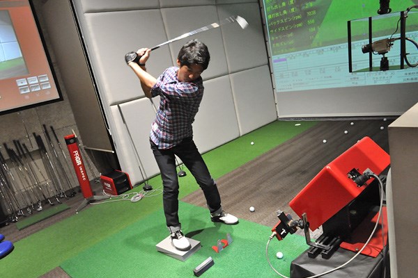 今度は、右足を少し高くして振ってみましょう。10センチくらいの厚さの箱を右足に置いてスイングすると、すくい上げることができなくなるので、自然に適度なタメのあるダウンスイングになっていきます。