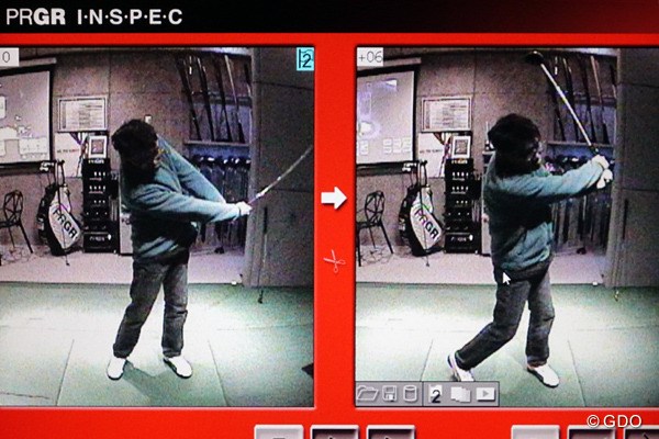 レッスン前(右写真)では、フォローで左ひじが伸びていませんでしたが、レッスン後(左写真)は左ひじがまっすぐに伸びています。左手首が甲側に折れず、正しいリリースができている証拠です。左腕は伸ばそうと思っても伸びるものではなく、正しいリリースによって勝手にそうなるのです。