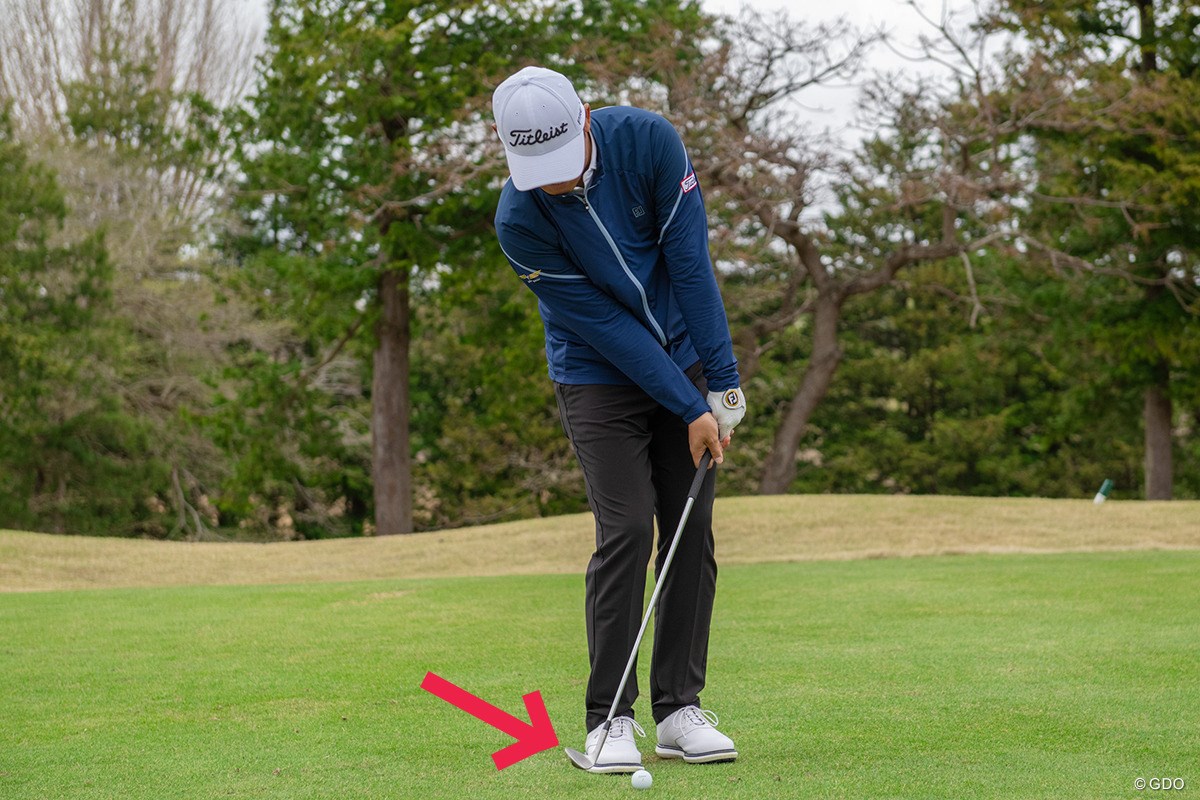 そのケースが多いです。アプローチの場合、地面より先にボールにコンタクトするのが大前提になりますが、その場合、ローポイントをボールより先にもっていけば、必然的にボールに先に当たることになります。逆に、ローポイントがボールの手前になると、地面に先に当たるのでザックリになりやすい。ボールを右に置くと、ボールに先に当たるような気がしますが、実際は右に置いたボールのさらに右にローポイントがきてしまうケースも多いです。