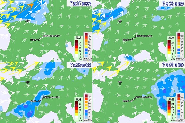 初日は南風だが、低気圧の影響で次第に西風に(2023/07/27)